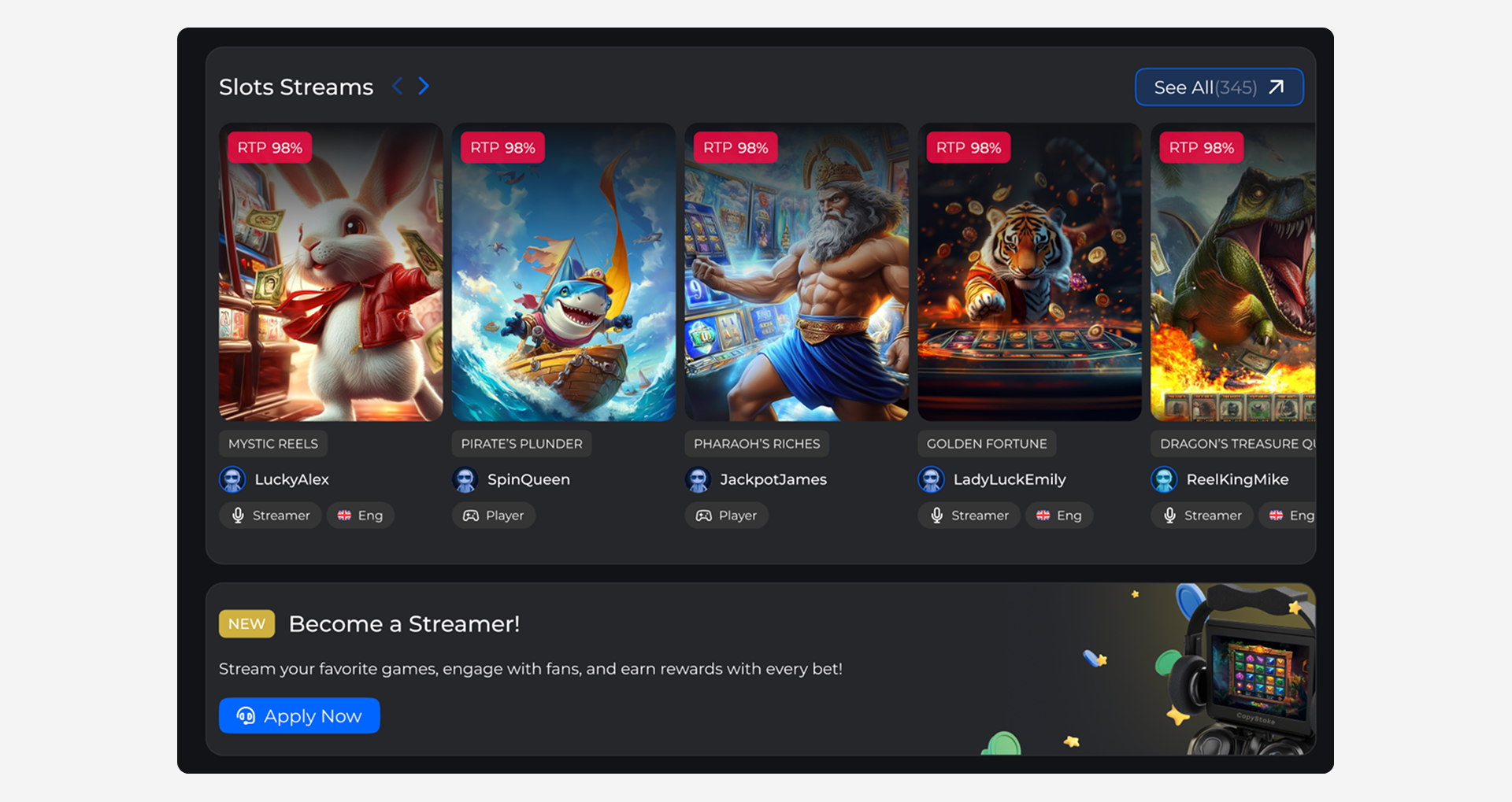 The feature gives players an opportunity to put on the hat of a professional streamer on the iGaming website. On the surface, Become a Streamer empowers the users: the operator shows that they believe in new talent among their customers. At the same time, the feature helps online casinos to promote themselves organically and scale their streamer teams for free. Particularly, businesses can: